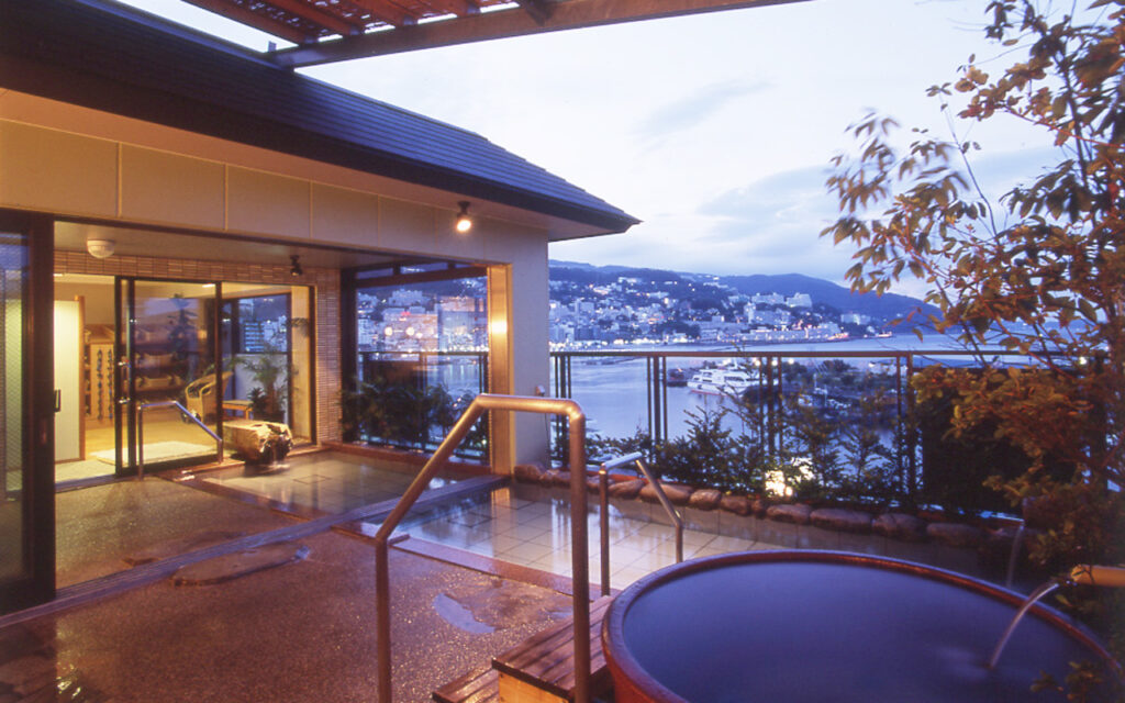 なかでも月の湯にある屋上露天風呂、「月下美人」は当館一番のおすすめ。熱海の夜景を一望できます。