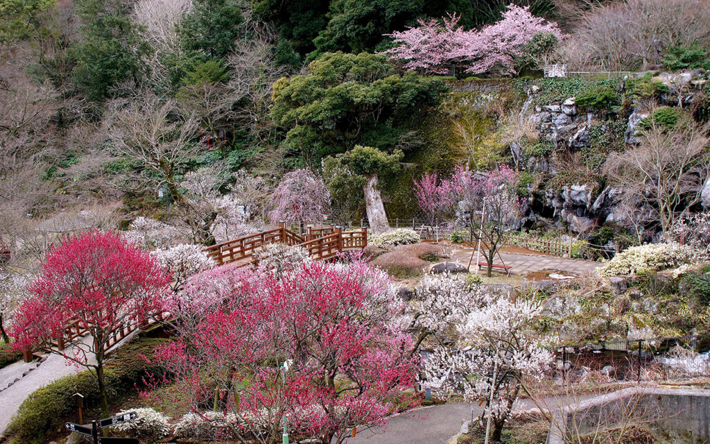 日本一早咲きの梅、そして遅い紅葉で有名な熱海梅園内。明治19年に開園。樹齢100年を超える梅の古木を含め64品種・約730本あります。