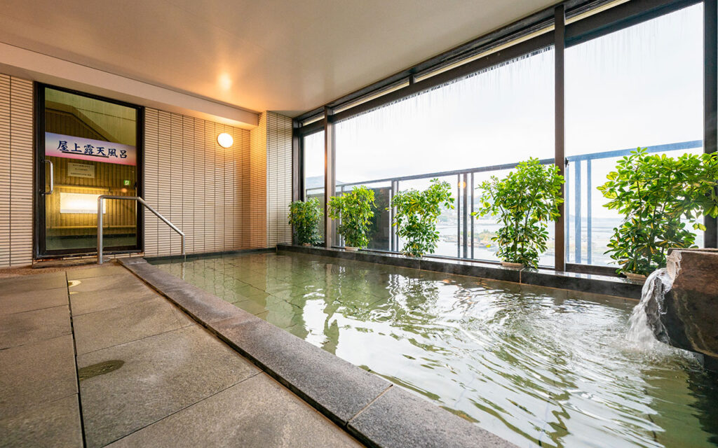ガラス戸を開くと、屋上露天風呂「月見草」と一体感で楽しめる、内風呂「花満月」。温泉気分いっぱいの眺めの湯でございます。