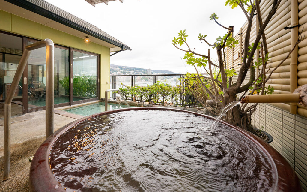 月の湯の「月下美人」に対して、花の湯の屋上にあるもう一つの露天風呂。熱海湾からの海風を感じながら入る、眺めの良いパノラマ風呂をお楽しみください。