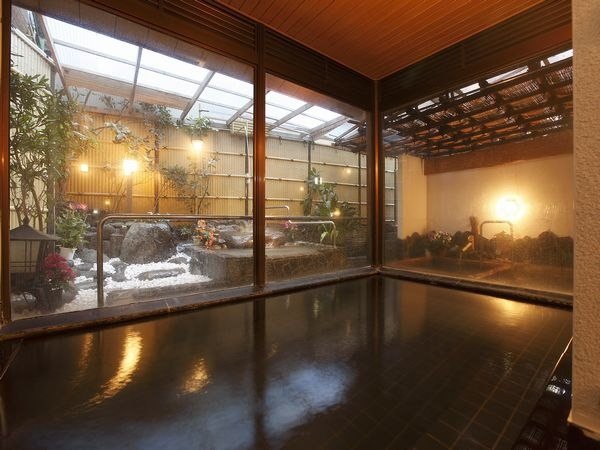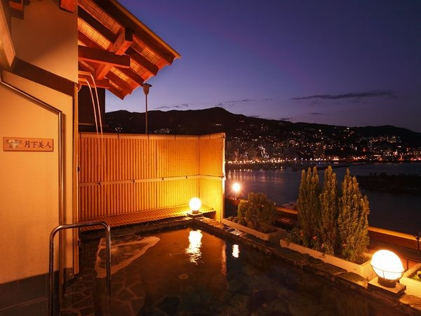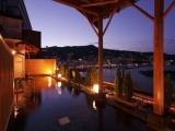 秀花園 湯の花膳は展望露天風呂「月下美人」に打たせ湯を増設、打たせ湯に打たれながらこの夜景、熱海の海を一望できます。