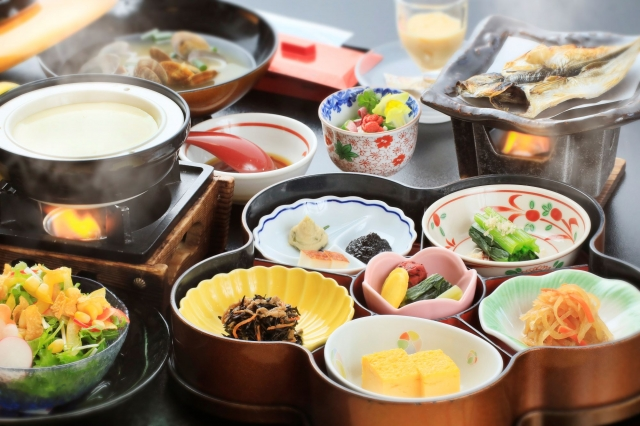 朝食は、当館の板前が腕を振るった絶品の和朝食☆朝作りたての【寄せ豆腐】は目の前で火を通し、アッツアツの状態でハフハフしながらタレに付けてお召し上がりいただけます。