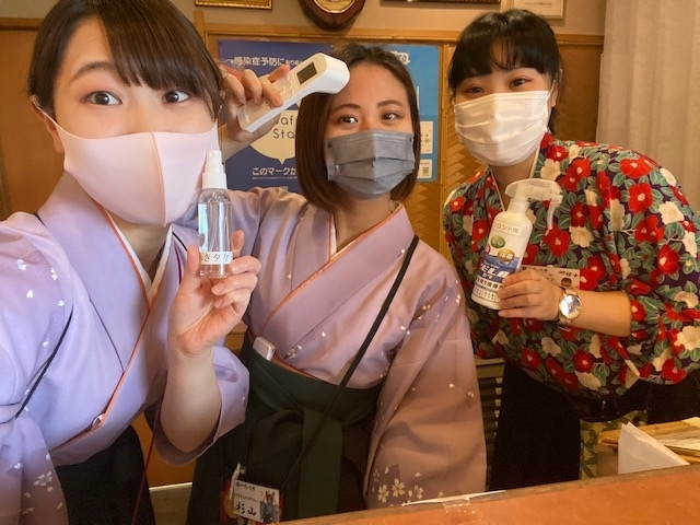 マスク着用は当たり前。さらに1人1本消毒液を肌身離さず持ち、お客様の物に触れる前にシューーッと清潔に手を消毒しています!