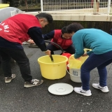 給水車に付いて、お水を取りに来た方へ水を入れたり、高齢の方にはご自宅までお水を届けたり。