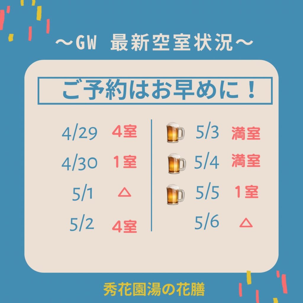 ゴールデンウィーク予約まだ間に合います!!